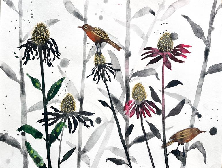 Nynke Kuipers is a multidisciplinary artist based in Amsterdam, the Netherlands. Her creative art encompasses drawings, paintings, comics, and graphic novels, utilizing a diverse array of materials such as crayons, chalk, watercolor, acrylic, thread, and collage, often combined to produce richly textured, mixed-media works. Kuipers's art is characterized by its playful and humorous tone, frequently exploring themes of nature, animals, and the human psyche. She employs a variety of techniques, including finger painting, to establish a direct connection with her materials, allowing for an intimate and expressive artistic process. Her portfolio includes notable works such as "The Blackbird and the Wolves," a piece that combines watercolor, pencil, embroidery, and lino-print to depict a nuanced interaction between wildlife and environment . Another significant work, "The Arrival of the Wolves," reflects on the reintroduction of wolves to the Veluwe region, blending acrylic and thread on linen to convey the complex emotions surrounding this ecological development. Through her art, Kuipers invites viewers into a world where the boundaries between reality and imagination blur, encouraging a deeper contemplation of the natural world and our place within it.