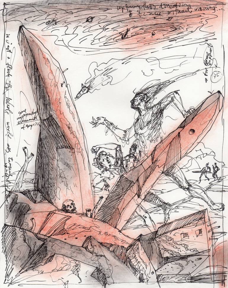Pen, ink, chalk, brush on paper.