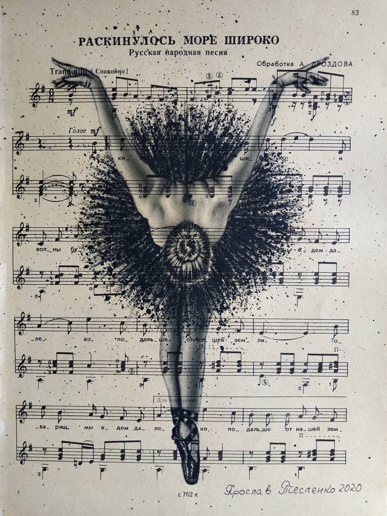 In my next picture, I drew a ballerina on old pages with notes. Music and dance series. The beauty of the female body, the beauty of the dancer, the ballerina... inspires new works... Drawn in charcoal and added splashes of acrylic on the ballerina's black tutu. This charcoal and acrylic work is no ...