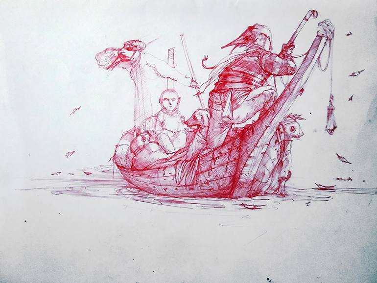 A take on the theme of the boat and the travel, a character is in the middle, the only human headed character, surrounded by animal-head companions, in a ship that is alone in the seascape