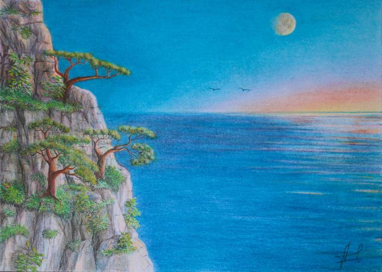 In the drawing I conveyed the beauty of the sea at dawn. The first rays of the sun above the horizon and a couple of birds. Birds as a symbol of freedom, love and life.Spread your wings and take off. The main plot of the landscape. I tried to convey the lightness and warmth of the morning in the dra...
