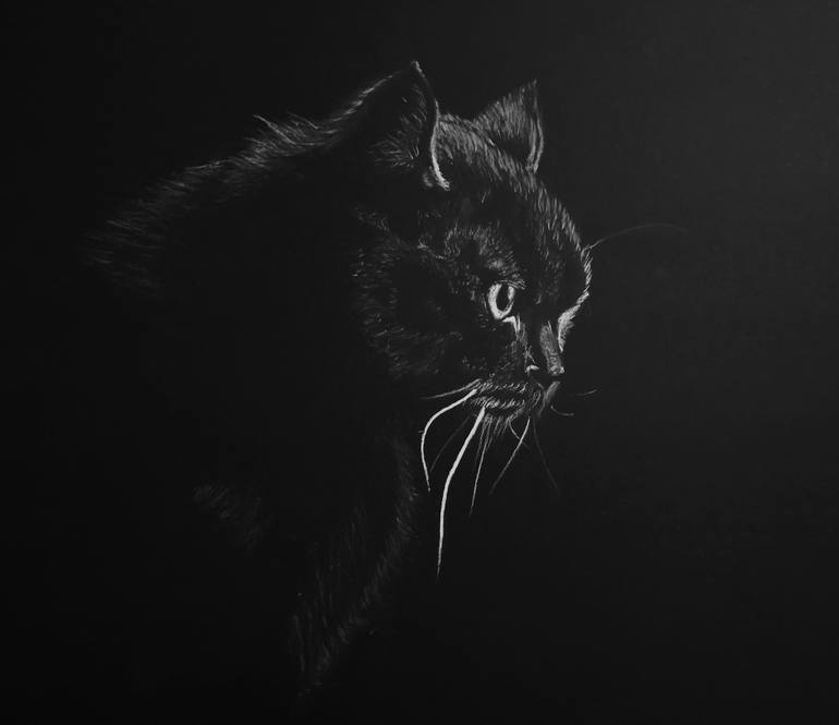 Black cat portrait Pastel pencil On black cardboard Dimensions 50 x 50 cm Cats are the best and cutest pets. I had the chance to live with one of the best cats ever! Just like this portrait, it shone through my dark days and brought light to my life...