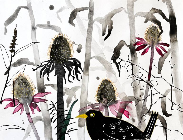 This drawing is created using aquarelle, ink, acrylic, and lino print. A blackbird perches among the coneflowers as autumn settles in. The flowers are heavy with golden seeds—a quiet abundance and a promise of new growth after winter. This drawing is not framed for shipping reasons. It is presented...