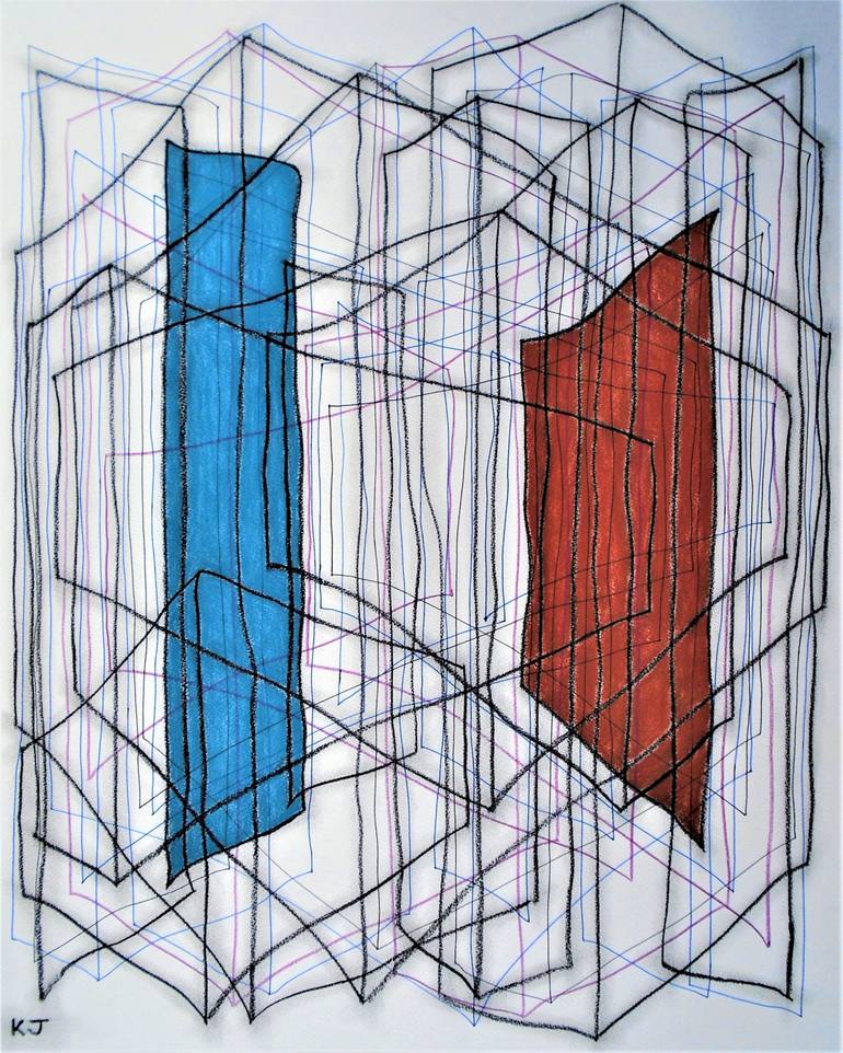 Free structural, expressionist composition; in an improvised linear manner influenced by city architecture. Fixed with professional fixative and rolled between acid-free tissue paper.