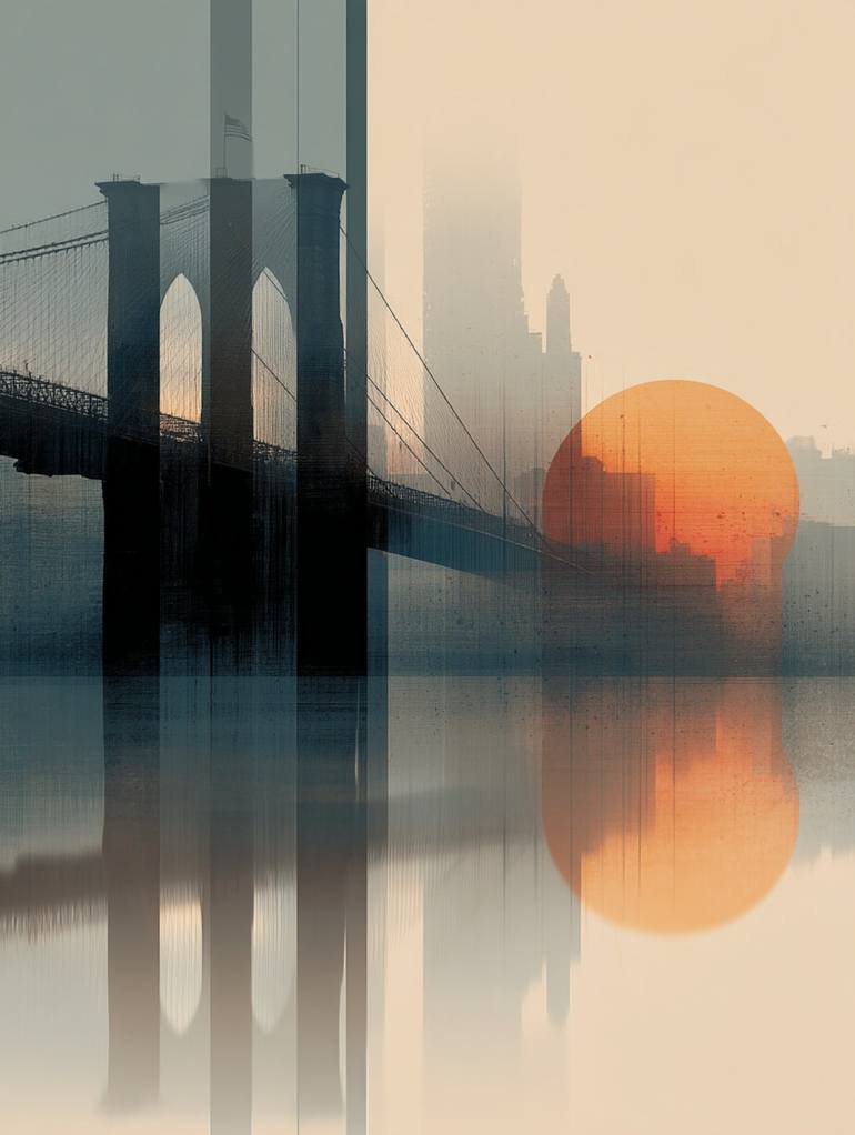 A study of the Brooklyn Bridge from the Brooklyn side of the river. Quick geometric style ink pencil and watercolour drawing.