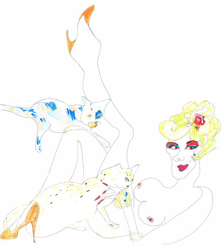 Kirsty McKenzie (B. 1982 Toronto, Canada) is an interdisciplinary artist, and costume designer. She graduated with a BFA in Fashion from the Rhode Island School of Design (RISD) in 2005. She prolifically creates paintings, drawings, mixed media collages, costumes, interiors, performance, sound, and video installations (such as "Cat Lady" and "Clown Frown", 2015), as well as her own universe in which she dwells. Her work is mostly figurative, and often depicts portraits of colourful characters with prominent queer and feminist themes; who defy sexual and gender stereotypes, and transcend traditional notions of beauty. Her art explores societal attitudes toward women and the oppression and objectification they endure, with strong themes of obsession, mental health, and substance abuse. Kirsty infuses these topics with humour and a child-like exuberance; with simplification and distortion of forms, and a brazen use of colour. In 2013, she faced her substance abuse and addictions that had overshadowed her life for 17 years, began her powerful, transformative journey of recovery. What began as an avid sketchbook practice, soon exploded into a full-blown art addiction. In 2014 she passionately redirected her focus from fashion & costumes to visual art, and rediscovered herself as an artist. Her work is often autobiographical, and her series “Warning Signs” delves into her drug addiction, recovery, and co-occurring bipolar disorder. These works focus on the anxiety, paranoia, frenzied obsession, and mood swings that come with the detrimental relationship of chemical dependency. The surreal sculptures and mixed media collages are dark yet whimsical and witty; some depicting the “third eye”, and how that is often blocked while in addiction. The 6th chakra or “third eye” featured prominently in her work, after experiencing a spiritual awakening in recovery, and becoming more in tune with this concept through her avid Kundalini and meditation practice. Kirsty has shown her work internationally, in numerous group exhibitions in London, UK and Toronto, Canada. Several of her works from “Warning Signs” were in "Chemcraft" (Christina Mitrentse Projects, Espacio Gallery, London, UK 2015), and "Prescriptions" (The Beaney museum, Canterbury, UK 2016). She has appeared on a BBC One interior design show, and been interviewed in i-D, to name a few, and some of her clients include The Guardian, and Teen Vogue.