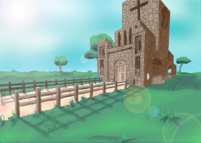 Simple illustration, hand made on paper, scanned and colored on the computer Rural landscape of a church in a field