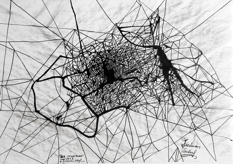 The map of a typical city in Europe. A confusing web of alleys, streets and dead ends. One of the earliest works of the artist. Original: Paper Size: approx. 12" x 17.5" inch. (30,5 cm x 44,5 cm) Media: Charcoal and black Ink on high-grade Paper Year of Creation: 1978 Make an Offer today before the ...