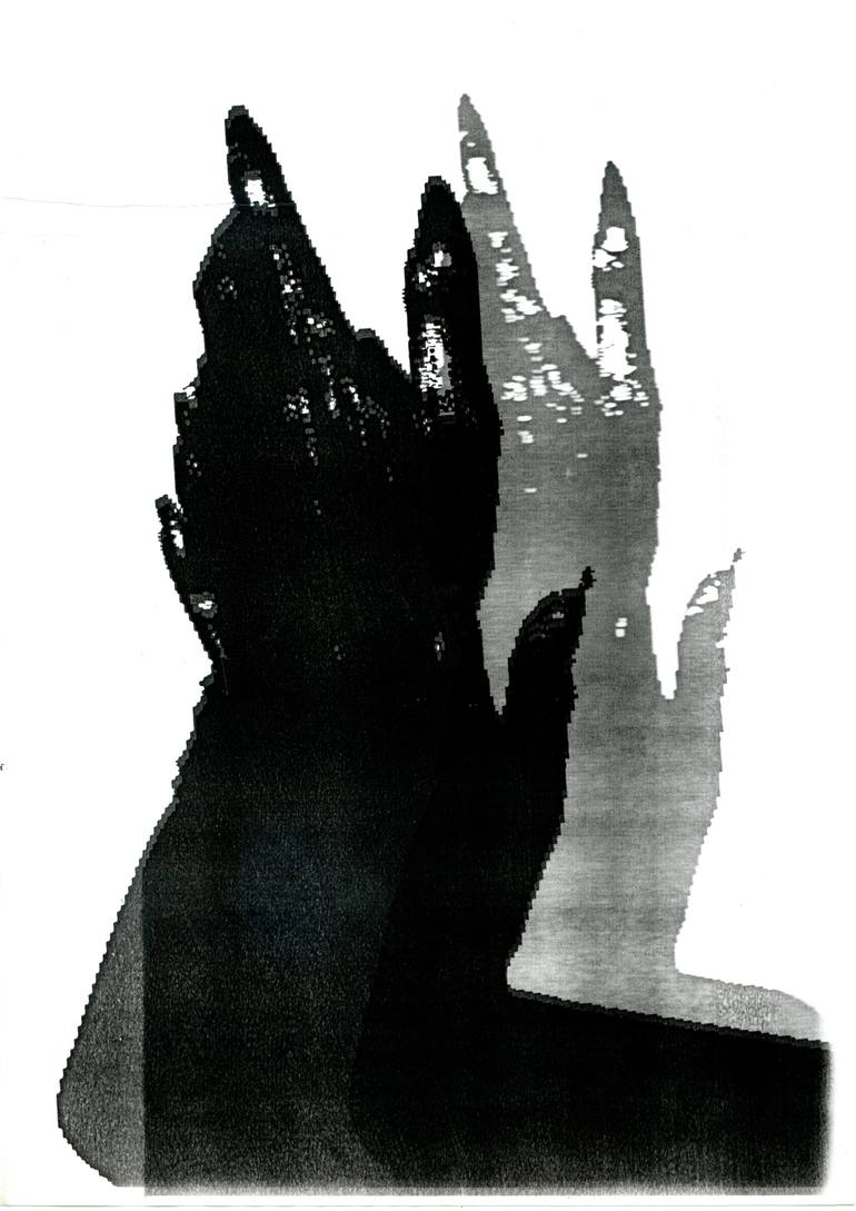 First I photographed an artist of a Flamenco house in Madrid clapping her hands. Then I developed the image in Black and White, and Xerographed it. Then I copied the image in a fax machine, and used the resulting image again in a Xerographic process, creating two layers. I selected one of the final ...