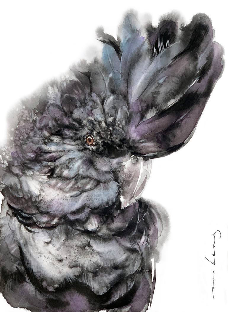 The crowning glory of the proud cockatoo is its striking head crest of feathery plumes that can bob and nod at will to display pleasure or excitement. Ink and watercolour on Saunders Waterford 300gsm smooth cotton paper.