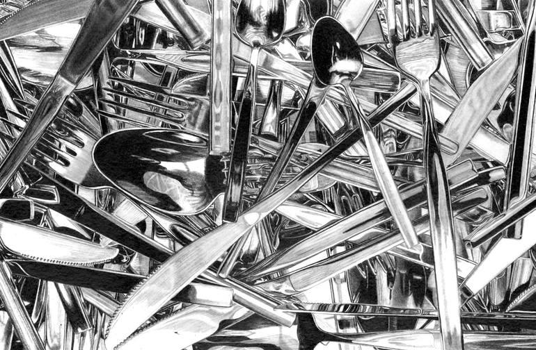 Not sure why I drew this one - guess it was the challenge - and it certainly was a challenge!! Cutlery otherwise known as Silverware, Flatware or Tableware including spoons, forks and knifes all drawn in Pencil. The drawing measures 49cm wide x 32cm tall and is on heavy weight 350gsm Bristol Board ...