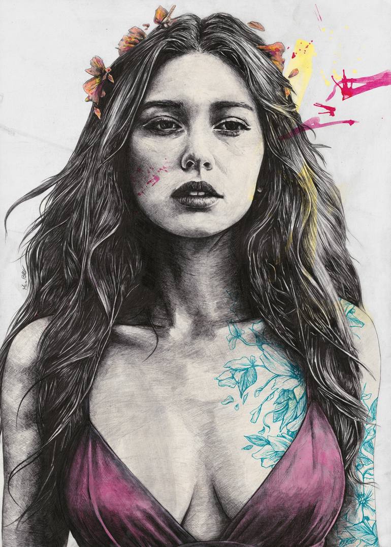 • A sensual woman with long wavy hair adorned with small flowers gazes forward. Her dress is a deep magenta, and splashes of color create a dynamic effect around her. Delicate doodle floral tattoos gracefully embellish her shoulder. • Graphite pencil, acrylic, gel pen • 250 g/m² Clairefontaine smoot...