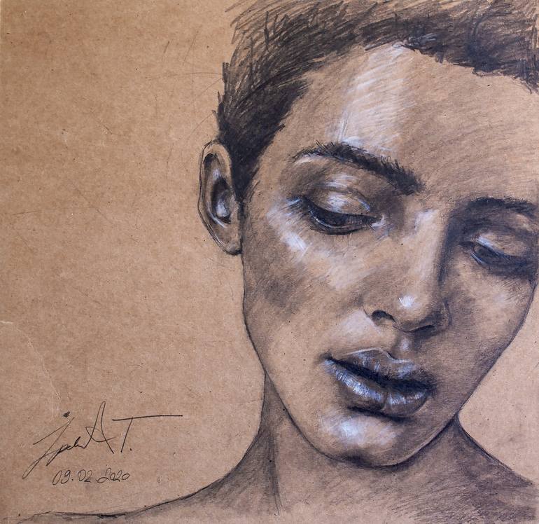 This artwork, titled "Decisions," explores a deeply reflective and contemplative state of being. The face, softly rendered with careful attention to detail, conveys an unspoken inner dialogue. The downward gaze and slightly parted lips suggest a quiet vulnerability, as if caught in the midst of an e...