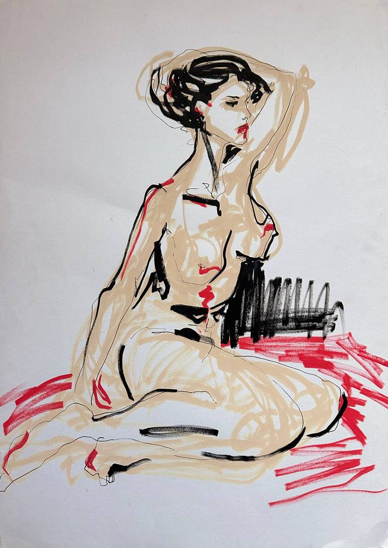 Large (A2 size) life drawing from model. Acrylic paint pen on white paper.