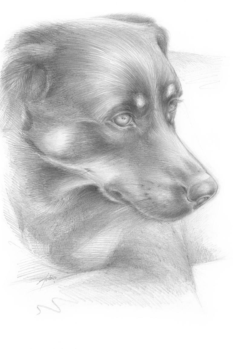 Realistic and detailed pencil drawing of a female dog. Portrait of Diana in black and white. My love of dogs inspired me to create a series of portraits in which I have drawn their faces in pencil on paper. I like to use a dense network of lines and subtle shades of grey to create the details and f...