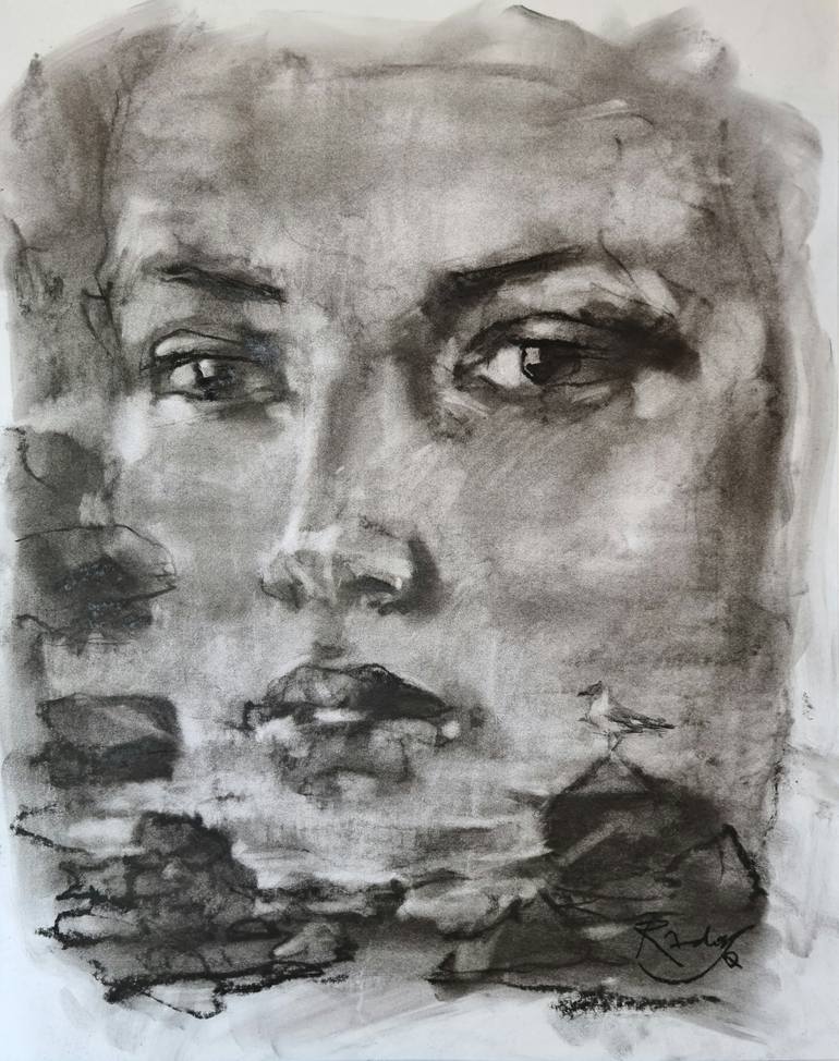 This pastel painting depicts a close-up of a young woman's face with a thoughtful expression, merging into the smooth surface of the sea in the foreground. A seagull, ready for flight, sits on rocks protruding from the water, symbolizing freedom and dreams. This image combines the beauty of nature w...