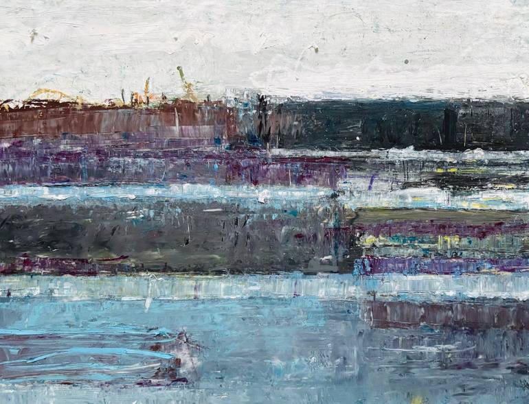 This scene was captured just after a snow flurry. The snow has partially settled giving the lanscape a pale mottled appearance The colours are muted and oil pastels help create a compelling and engaging image.