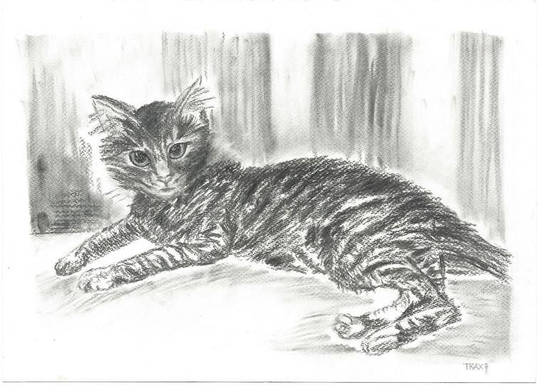 Elegant Black and White Cat Drawing Elevate your workspace or find the ideal gift for a cat lover with this exquisite black and white drawing titled "My Cat" by Diana Dimova-TRAXI. This portrait of a kitten, rendered with meticulous charcoal strokes, captures the elegant simplicity and charm of fel...