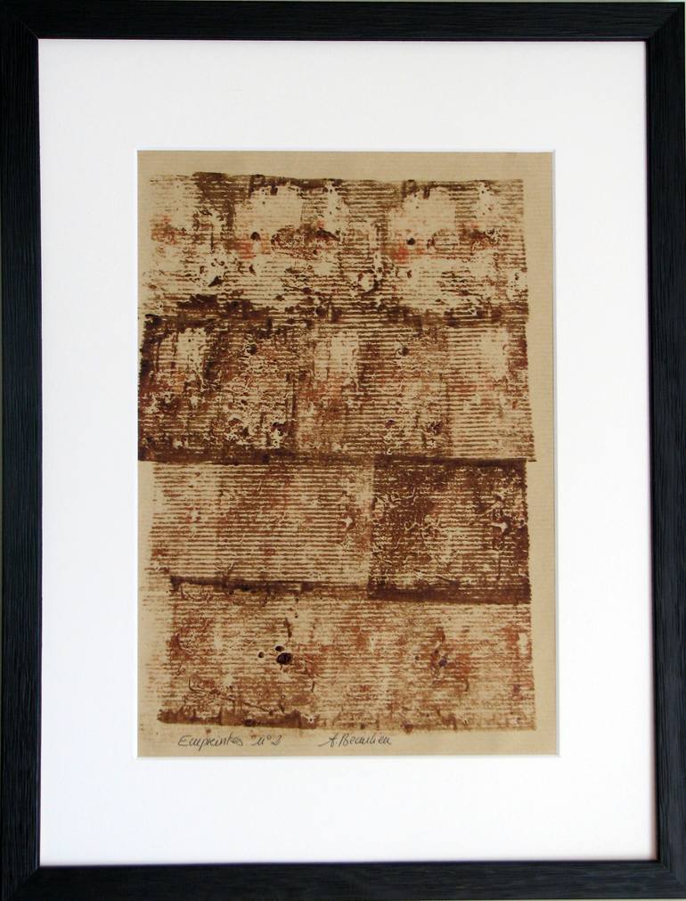 D’une extrême sensibilité, les cinq sens toujours en éveil, je ressens le monde autant que je le perçois. Contemplatrice, la vie m’émerveille à chaque instant, faisant de la nature une inépuisable source d’inspiration. J’ai grandi auprès de ma grand-mère paternelle. Fille d’un égyptologue, née au Caire, un quart de siècle passé en Egypte. Le récit de sa vie dans ce pays dont la civilisation pluriséculaire a bâti ces prouesses architecturales gardées par des géants de pierre qui, aujourd’hui encore, nous fascinent a profondément marqué de son empreinte mon imaginaire d’enfant. Ses histoires avaient pour décor des temples en ruines, des pyramides, des tombes merveilleusement décorées de dieux thérianthropes, ses personnages étaient des momies. Les noms des lieux eux-mêmes sonnaient « exotiquement » à mes oreilles : le Caire, Ismaïlia, Deir el-Bahari, Alexandrie, Assouan, Louxor… C’est ainsi que, très jeune, j’ai pris conscience de la diversité du Monde, de l’existence d’autres peuples, d’autres cultures, d’autres coutumes, d’autres formes d’art, qui jamais n’ont cessé d’aiguiser ma curiosité et continuent de me fasciner. Toutes ces influences m’ont nourries, ont éduqué mon goût, forgé mon univers : très éclectique, meubles anciens patinés par le temps, objets ethniques du monde entier portant l’empreinte de l’artisan qui les a fabriqués, mêlés à de petits morceaux de nature, tels que fossiles, écorces, coquillages, pierres… J’aime l’empreinte que laisse le temps qui passe sur les matériaux, comme la rouille sur le métal, le vert de gris sur le cuivre et le bronze, les marques d’usage et les trous de vrillettes sur le bois, la peinture écaillée laissant apparaître les couches sous-jacentes. Ma peinture, très instinctive et fortement marquée par ces influences résulte autant d’une recherche sur la couleur, que d’un travail sur la matière, dont les reliefs souvent constitués de sable, ne sont peut-être que la réminiscence inconsciente d’un désert fantasmé.