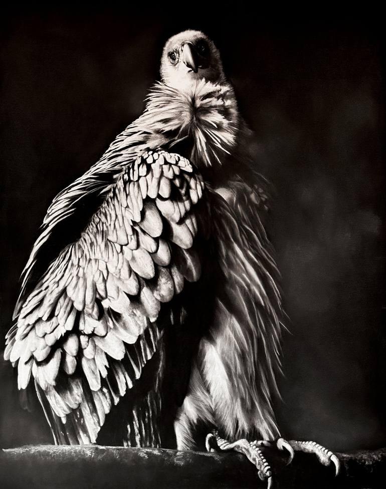 This striking monochrome portrait of a vulture reveals the intricate details of its feathers and the intensity of its gaze. The artists meticulous realism brings this magnificent bird to life, showcasing the textures and patterns that define his majestic presence. The dramatic contrast between light...