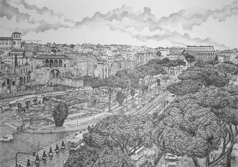 This artwork was done with pen and pencil on A2 paper (59.4x42)cm. Combining the crosshatch technique. 180° panoramic view of The Eternal City (I) (II) (III) - from Piazza Venezia to The Colosseum. (III) Third section Inspired by The Via dei Fori Imperiali, straight to the Colosseum, seen from the...