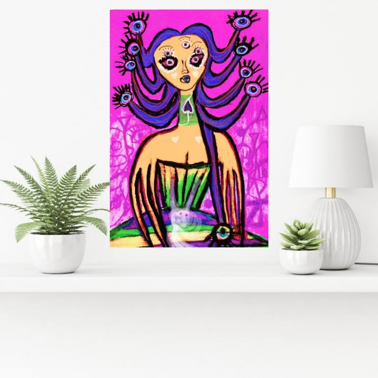 The painting is drawing once with colored pencils and pastels and then painting is made with digital colors with a multilayered approach .I use classic colors painting techniques digitally,resulting in vibrant colors and a long-lasting piece of art.The painting is created by hand on a,digital device...