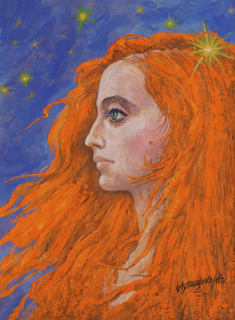 Portrait of a romantic girl who at night loves to look at the starry sky and dream. She fantasizes, composes fairy tales and lives her life in them. Fiery red hair fluttering in the wind, large green eyes resemble characters of stories that she invented herself. I called this portrait "Fairy Tale". ...