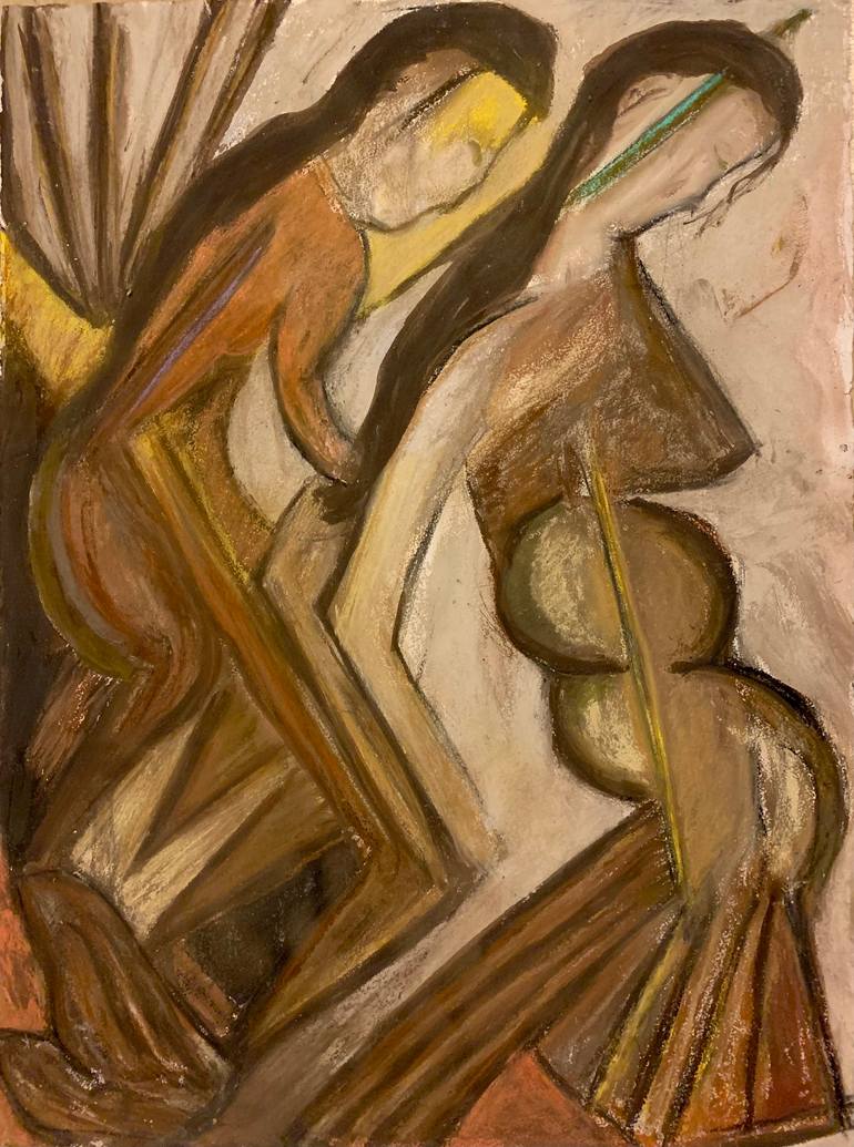 Pastel with two figures decending stairs in brown tones