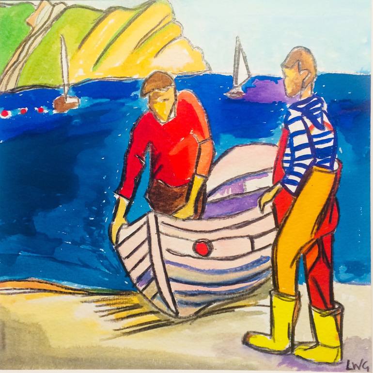 Sketch of the Miller fishermen at Lulworth Cove, a family of fishermen who have fished at the at the cove for over two hundred years. This sketch was drawn in 'situ' in conte, gauche and drawing inks on water colour paper.