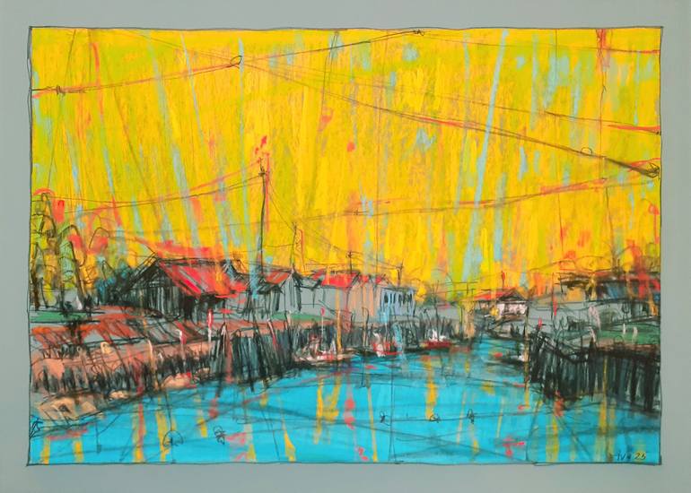 Fishing village near Bordeaux, Aquitaine (France), in the sun's rays. Soft pastel, charcoal and pierre noire on special paper Pastelmat, 70x50 cm, 2025. Signed on the front. No frame.