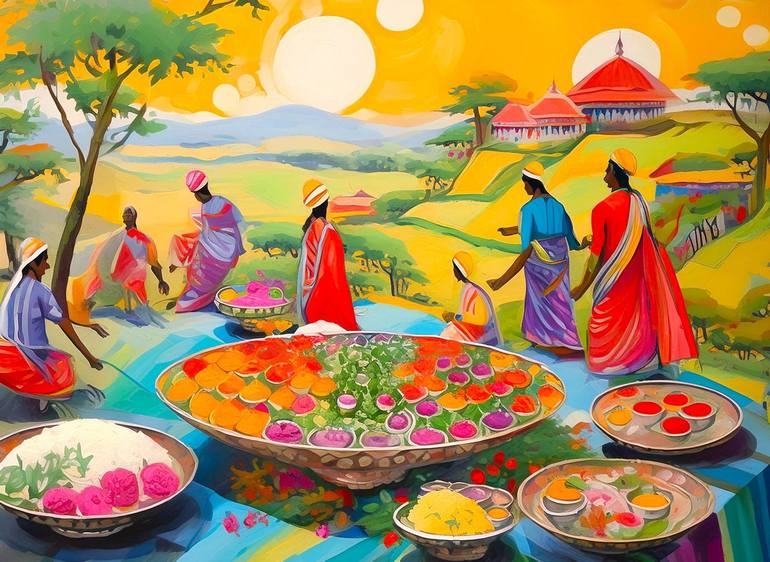 Food Culture A painting of people preparing food together in a village in India captures the essence of communal harmony, cultural heritage, and the joy of shared labor. It symbolizes the importance of food as a unifying force, reflecting collective effort, mutual support, and the deep social bonds ...