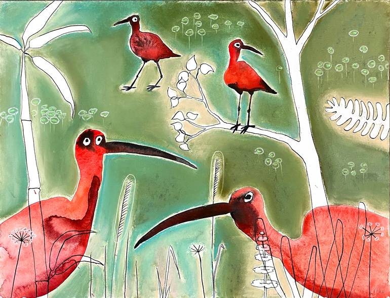 This original drawing features four scarlet ibises in a waterfront setting. A hanging plant adds a touch of nature to the scene. The contrast between the red birds and the green water and background creates a visually striking effect. Crafted with aquarelle, ink and soft pastel on paper, this piece...