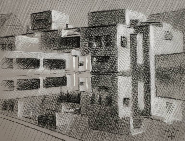 Gemeentemuseum 05 (2014) My project 'Gemeentemuseum' done in hatched lines and in a cubistic way. I felt the theme was not worn out by the previous pastels yet. Pastel drawing on Canson Mi-Teintes Touch paper (47 x 62 x 0.1 cm) Artist: Corné Akkers