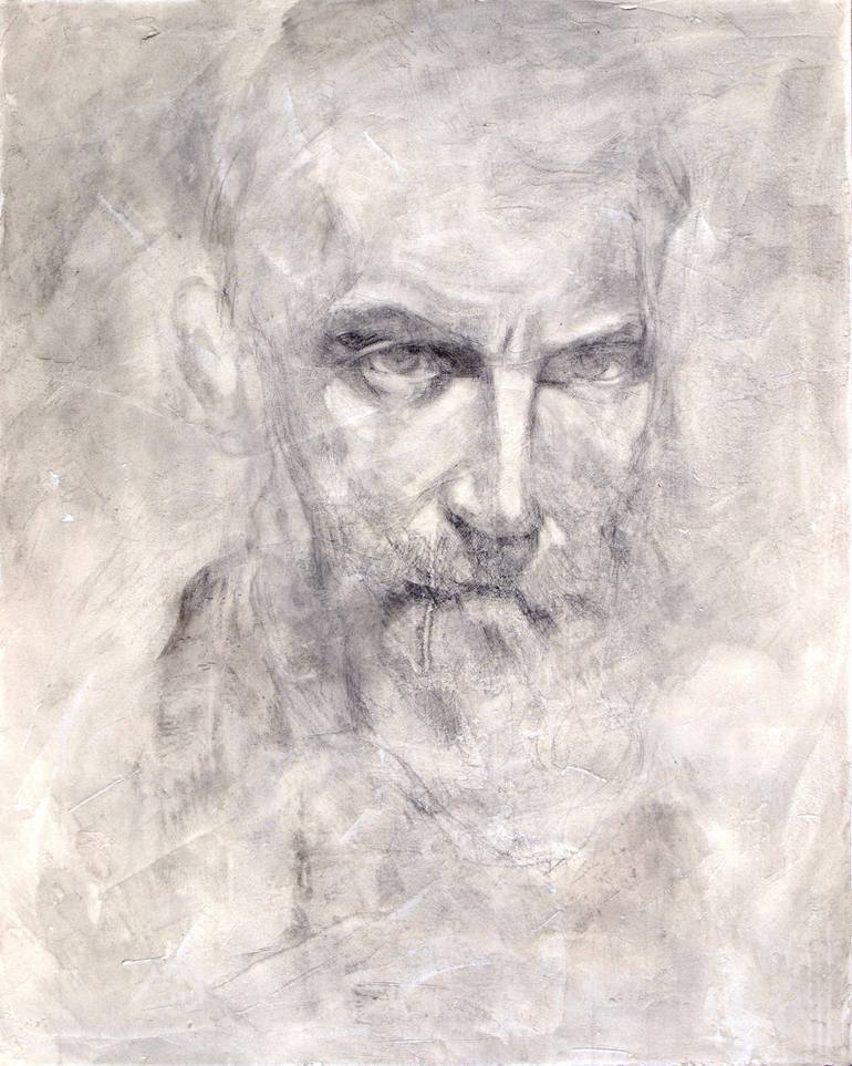 Portrait de Georges Bernard Shaw .J'ai été fasciné par une photo de cet auteur. Ici une ambiance mystérieuse entre rêve et réalité ,mémoire et oubli. Je travaille un dessin avec différentes mines graphites puis je vaporise certaines parties avec de l'eau pour les flouter ou les faire disparaitre .