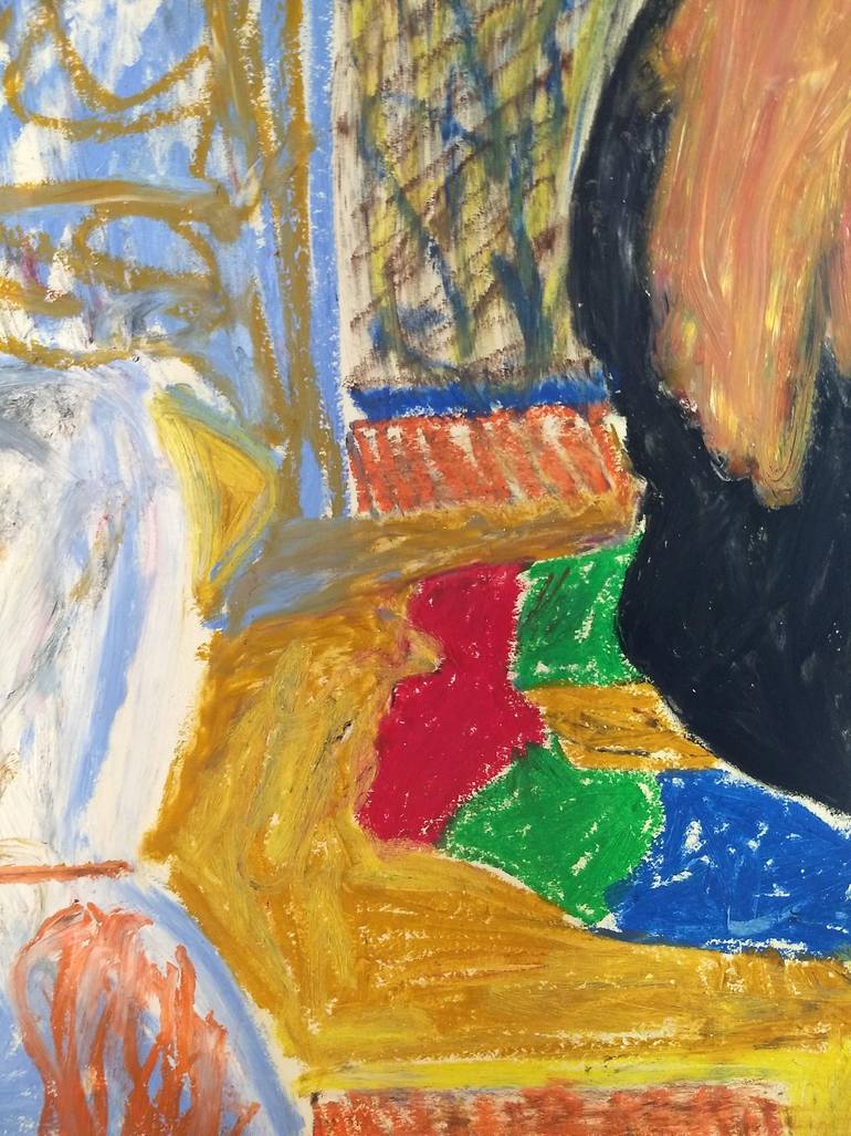 Abstract oil pastel drawing of an interior scene in which a child kneels on a chair.
