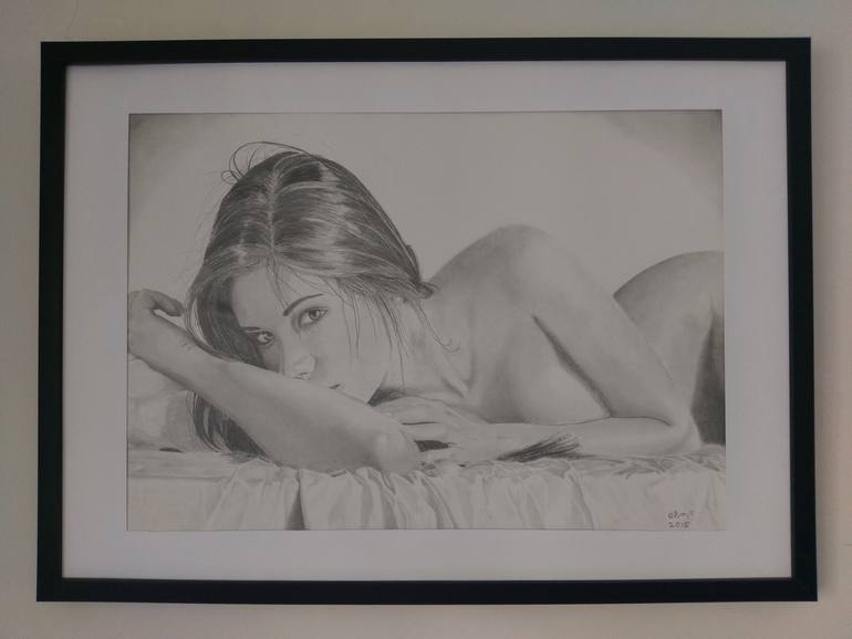 There is no real story behind this. I initially intended for it to only be a piece to practice using graphite--something to just keep in a sketchbook. This girl on the bed ended up being the outcome of that. This drawing comes framed and the size as stated is the size in its frame. The actual dr...