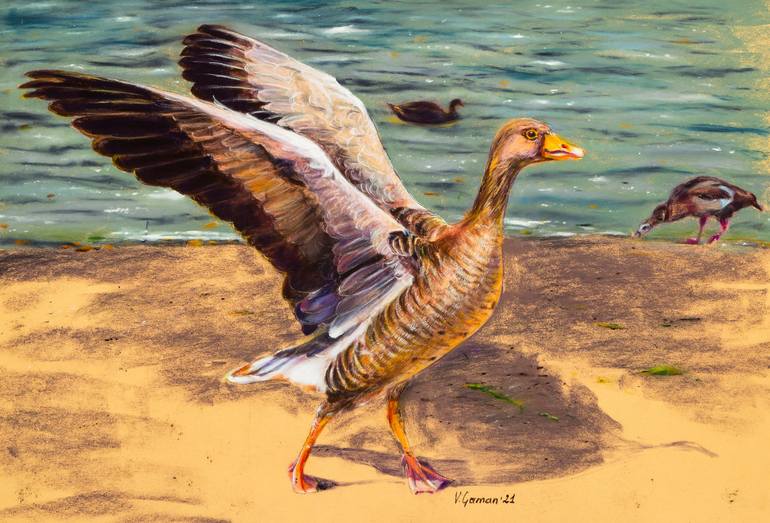 Gray wild goose. Pastel painting. Realism. The wild gray goose is a very proud bird. And very smart. And also these are the most faithful spouses. It is known that if one of the couple dies, then the other dies of boredom. Therefore, geese, like swans, are considered a symbol of loyalty. In my draw...