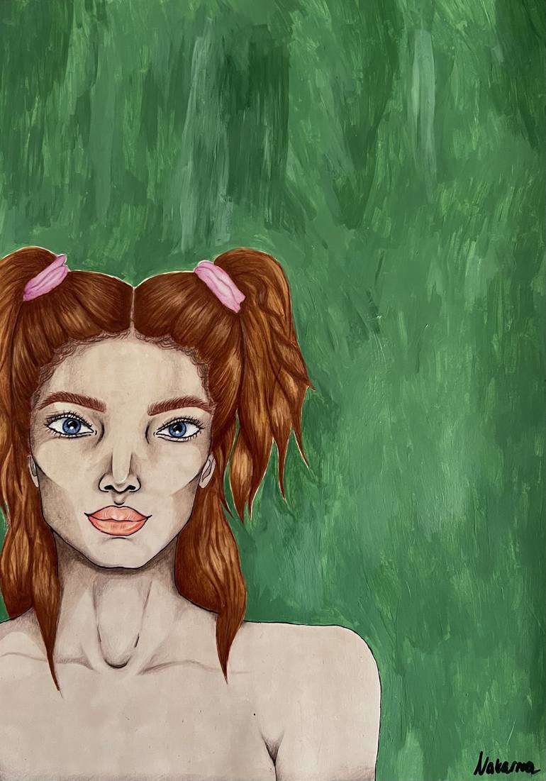 painting with colored pencils, used paint for the background. She comes right from my head, and has both a little smile but also serious look on her face. Changes of your mood!