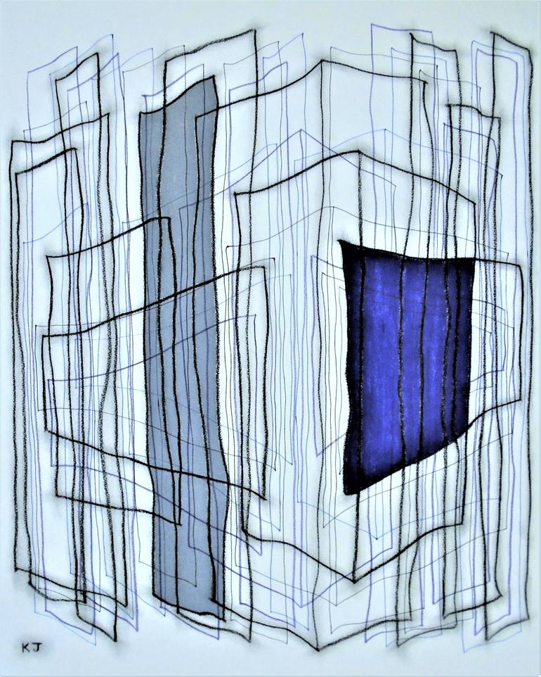 A free structural, expressionist composition inspired by city landscape; overlaid several times and including two opposing colours. Fixed with professional fixative and rolled between acid-free tissue paper.