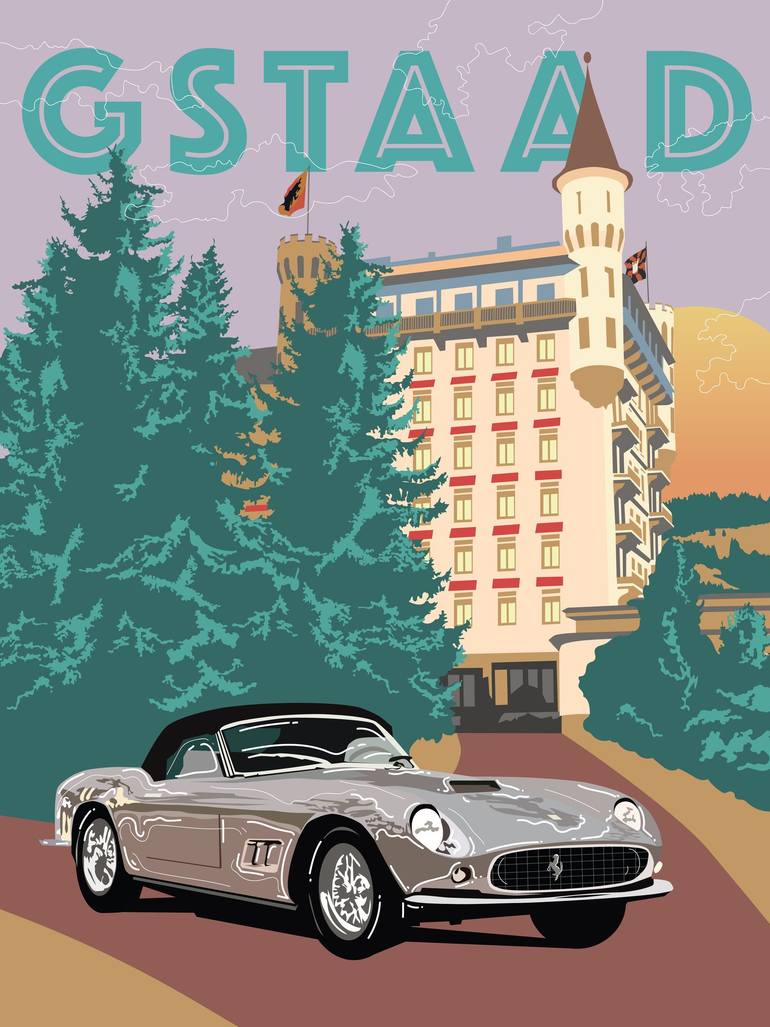 Vintage poster with Ferrari california spyder in Gstaad