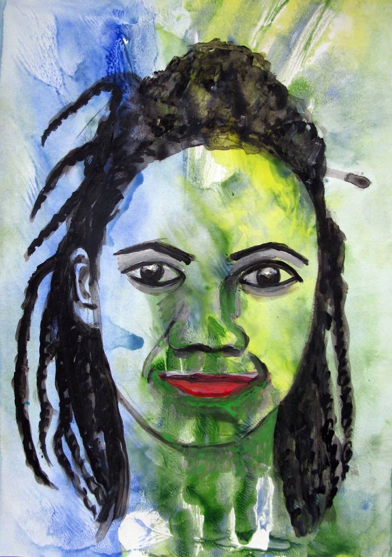 This is one of a series depicting heads of women. This is a work on paper using watercolour, gouache and acrylic. I have used colour and line in an expressive way to create a strong and vibrant image.