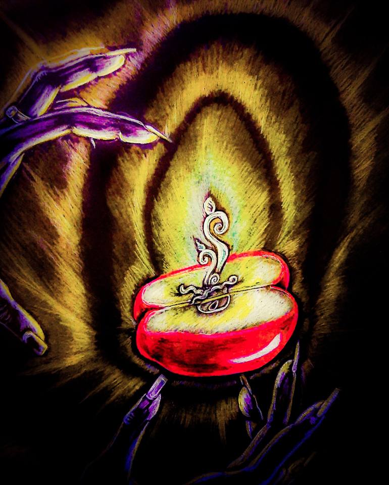 Inspired by the movie " Fern Gully" Help it Grow depicts a pair of hands hovering around an apple as they appear to help the seed inside sprout. Hand drawn with colored pencil on black paper.