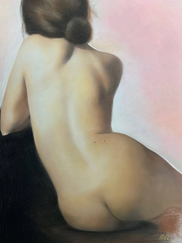 This work depicts contemplative state of mind. Young woman dreamily resting in the sitting pose, thinking about her life and a future. Will her hope and dreams come true? Pastel sticks on paper, custom framed. Size with frame is 32 X 34”.