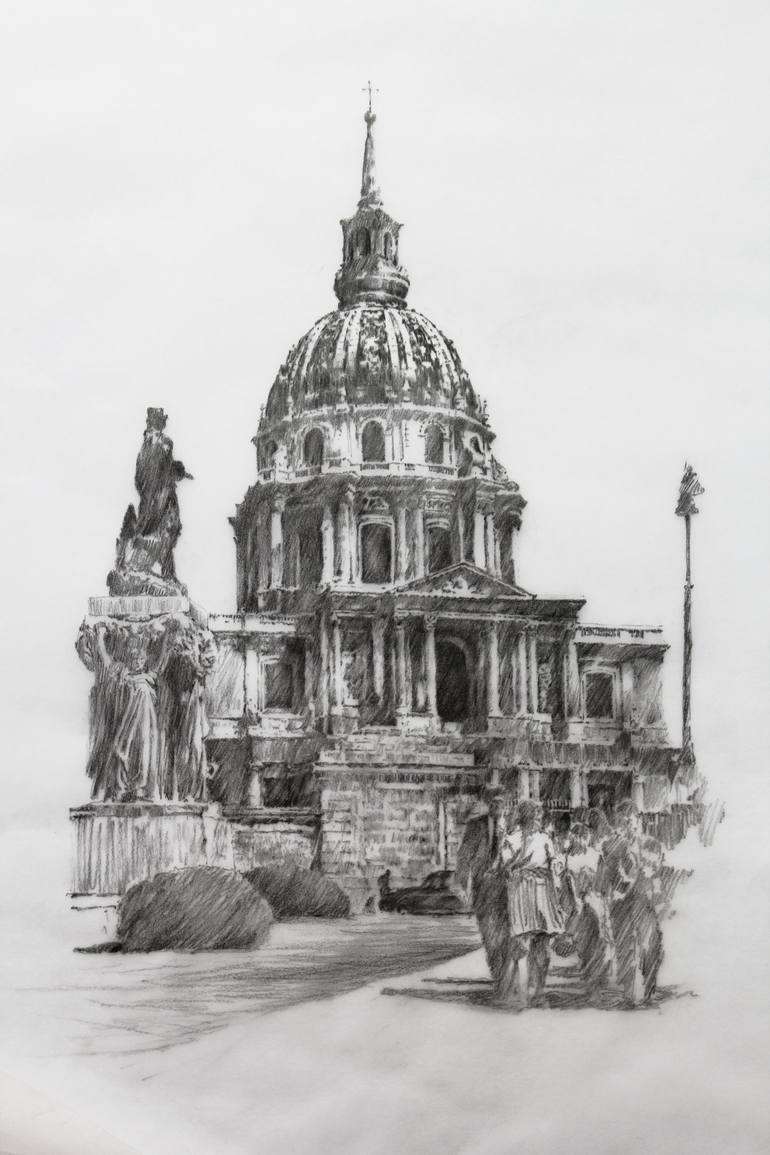 The academic way of depicting the reality is becoming extinct. This drawing is my private tribute to old masters, architects of L'hôtel des Invalides, Paris and a bow towards patience and admiration for craftsmanship. // pencil on tracing paper, size of a3, the drawing itself takes a bit less space...