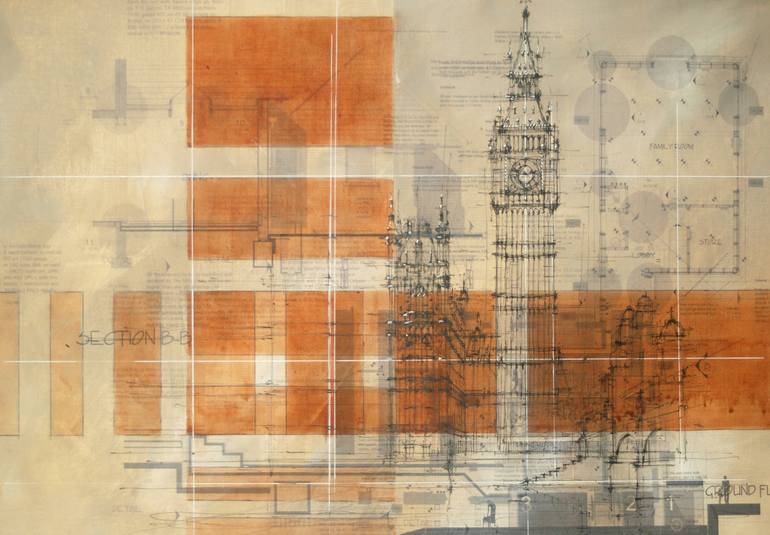 Ink drawing of the Houses of Parliament set against technical drawings.
