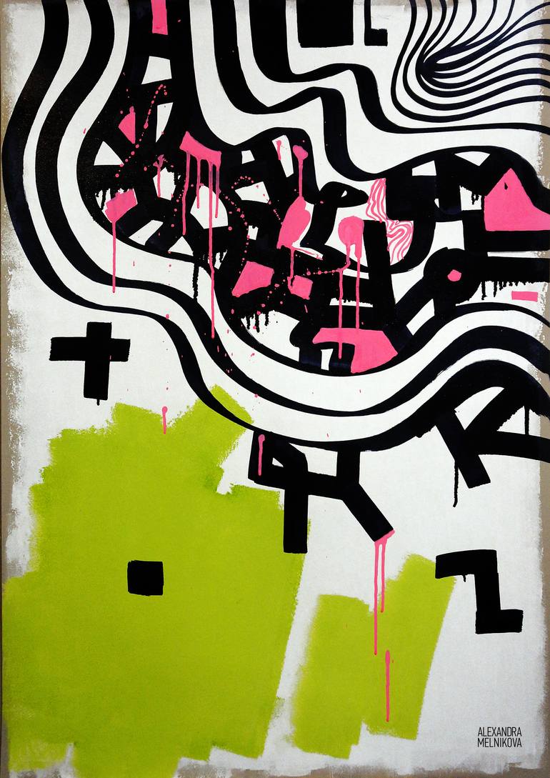 This is a abstract memory «I Love U». About beeting heart when you love some one and lost it forever. Green its about live and health, pink its a feeling inside you, butterflys in a belly. Black graphic its a code, message for friend, who left us and went in better world