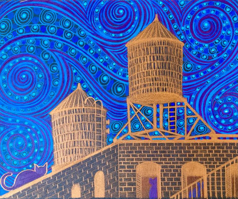 New York City is famous for its iconic water towers that grace old buildings of yesteryear. They are made of wood not metal because when winter time comes, the water will not freeze. Cats on a hot tin roof inspired me to do this drawing. I used to run around on the rooftops when I was a kid.