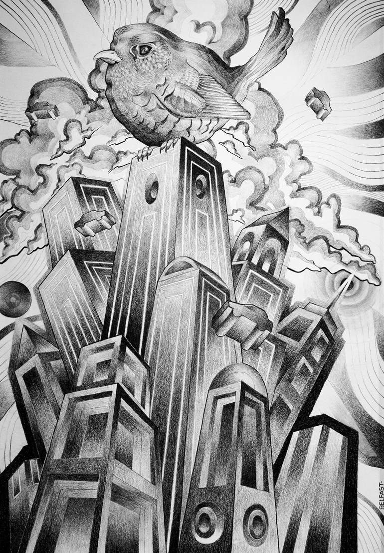 My work is done in charcoal and most people think it looks art deco too Aztec, I use lots of lines to create tone and form that run on a gray scale,