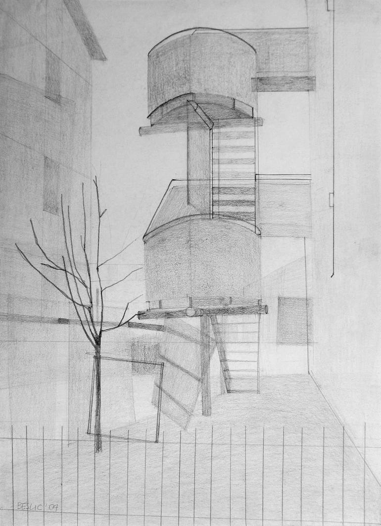 SERIES OF DRAWINGS "DEMATERIALISATION OF PICTURE" Drawings titled "Silence" show urban spaces without human figures. Motives on drawings are drew using different perspective points and plans. Transparent plans overlap each other, creat a confusing urban cityscapes.