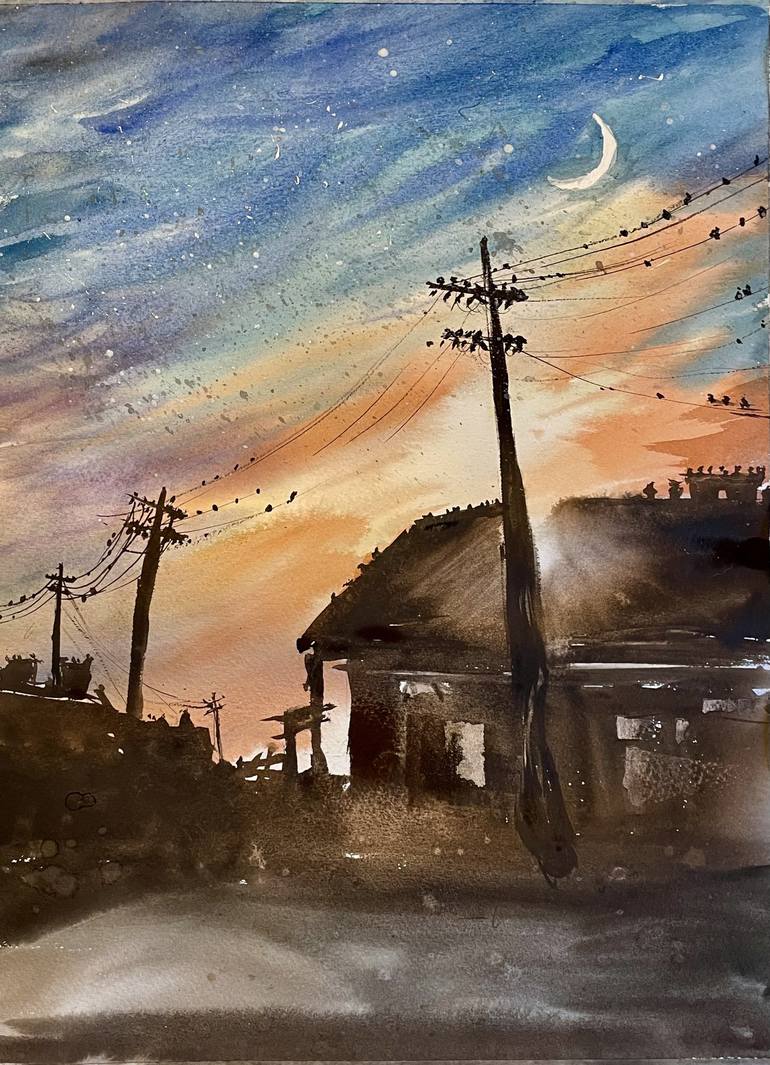 This watercolor painting is a testament to the loose and expressive technique of the artist, capturing the essence of a rural street in Jamaica during a mesmerizing orange and blue sunset. In this artwork, a quaint house and a solitary post take center stage, appearing as silhouettes against the bac...
